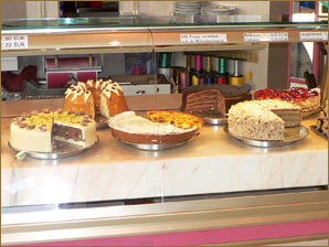 Unser täglich wechselndes Programm an Kuchen und Torten umfasst die Klassiker wie Frankfurter Kranz und Schwarzwälder Kirschtorte genauso wie neue Kreationen (z.B. Torte von zweierlei Cappuccino-Mousse und Cocos-Maracuja-Sahne).