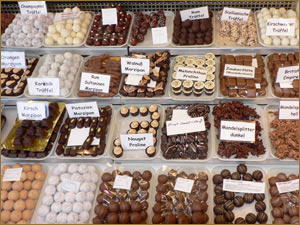 Unser vielfältiges Angebot an „kleinen süßen Verführern“ lässt die Herzen aller Naschkatzen höher schlagen. Mit über dreißig Sorten selbstgemachter Pralinen, Trüffel und Schokoladen sind wir in der Region absolut führend. Wir verwenden ausschließlich Schokolade der französischen Firma Valrhona, die zu den besten der Welt zählt.